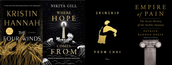 There are, of course, many more style routes that designers can choose. Let’s contemplate two final trends. First, a monochrome background with a contrasting color can be visually arresting. The below black-hued covers create an understated, somber tone. The generous use of negative (empty) space contributes to a feeling of gravitas.