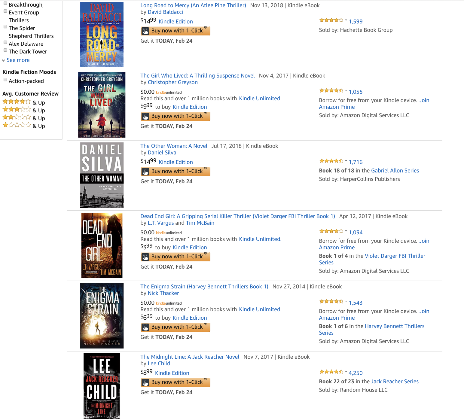 Head over to Amazon and search in either their Books or Kindle Store departments for “thrillers.” Notice anything in common with these thumbnails?