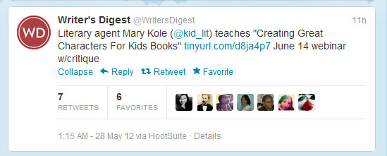 If you aren’t involved with Twitter yet, you should consider signing up. If the twitterverse seems big and scary, check out this awesome writer’s guide to twitter (by Debbie Ridpath Ohi AKA Inkygirl). Make sure to follow these and other writers in order to build your very own writing community on twitter. Their resources and advice can be priceless both as you improve your own writing and learn about the business of writing.
