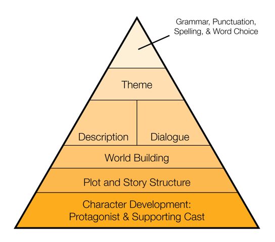 I begin the revision process with the most basic points (character and plot) and then work my way to the nitty-gritty details (theme and language). This idea is based on Maslow’s Hierarchy of Needs, where you want to fulfill your book’s more basic and urgent needs first, then move on to the smaller components. This means focusing on your overall book first, then breaking it down act-by-act or scene-by-scene for more detailed revision. The graphic below gives an overall view of how I like to break down the revision process.