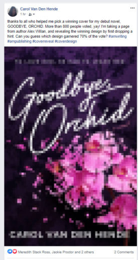 One of the strategies she used was to ask her audience for feedback on the image they liked best. She did her cover reveal by releasing it in segments as to generate excitement for the ultimate reveal.