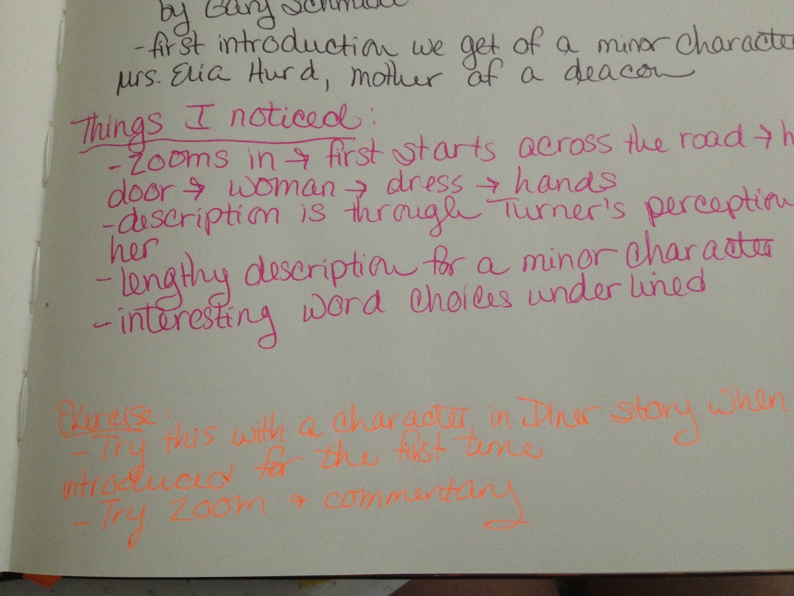 If you write out or type up what you love, then you can mark it up. When I studied Schmidt’s character introduction, I used a colored pen to mark unique word choices he picked to describe the characters.