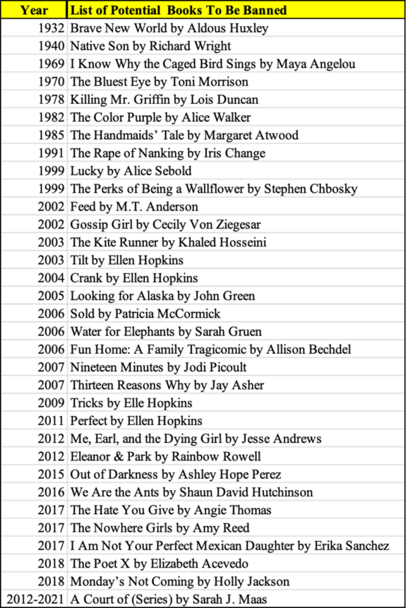 The books proposed were published between 1932 and 2021. Nearly 75% of the authors on this list are White women and more than half of the novels are from the young adult (YA) genre. A quick internet search reveals that all the titles listed have been individually banned by other states or have appeared on book ban lists. On the surface, this seems to be due to the depictions of sexuality, coarse language, substance use or abuse, or violence. However, after drilling down a little deeper, it became more apparent in most cases that these novels were banned because they made some parents, conservative politicians, and religious groups feel uncomfortable about the marginalized communities and experiences on which they were centered. Some of the common themes were related to: