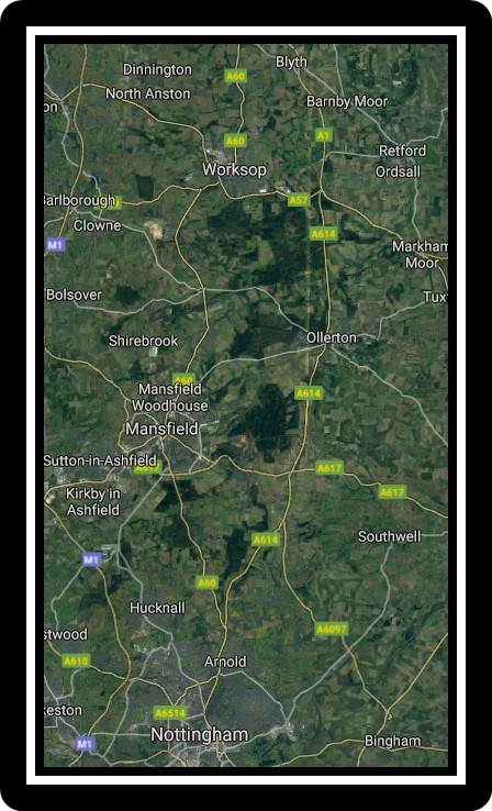 A look at a Google satellite view such as this screen capture above would lead us to believe there’s not much left of a once vast forest. It’s true that much of the forested lands are quite reduced in area from what they would have been long ago. (It should be noted that the town of Nottingham was once within the area designated as the forest.) And the character of the remaining woodlands has certainly changed since the time of Robin Hood. No longer the hunting preserves of the nobility, they’re now more likely to be country parks.