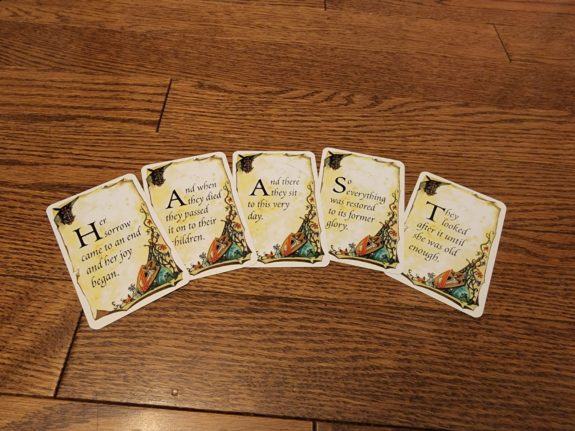 This game helps me to explore fairy tale roots in oral storytelling. It reminds me that a part of this type of story is how it sounds out loud. It helps me break down elements of a story that I may not fully consider on their own. I find this to be especially true of the aspect cards. They inspire me to explore ways to make the mundane fantastic.