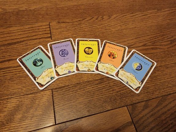 There are also special cards that players may be dealt in their original hand called interrupts, these allow players to interrupt without one of their specific cards being used in the story being told. These cards instead have one of the five card types on them and may be played to interrupt the current storyteller and take on the mantle if the storyteller plays any card of the type on that interrupt card.