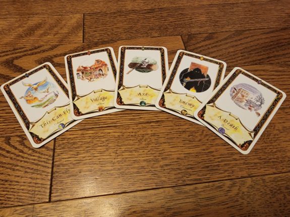 For example, if I were the storyteller and I said, “The cat picked up the staff in his mouth and began to rise into the air. He had never seen the forest from so high up though he had always been one of the best climbers in his family. The staff carried him higher and higher, he could see birds, beasts, and every tree of the forest.” I could play a card that says “Cat,” “Staff,” “Forest,”  or “This can fly” because these are parts of the story that are making an impact on the tale. However, I could not play a card that said “Bird,” “Beast,” or “Tree” because these were simply mentioned but did not do any heavy lifting.