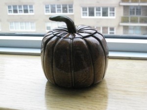 I found this ceramic pumpkin at a thrift shop and bought it for $1. It’s small enough to fit on the window sill next to my desk but big enough so I can fill it with slips of paper containing notes and ideas for stories. The pumpkin shape is key because it reminds me that I should only harvest my ideas when they are ripe and ready.