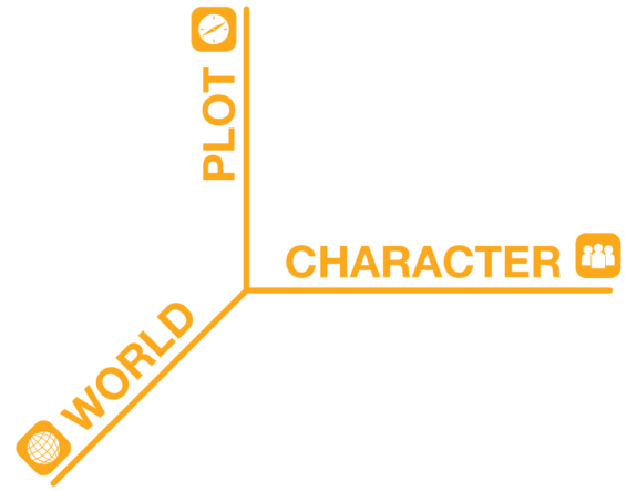 I believe stories exist in a three-dimensional space, where each dimension is a fundamental element of storytelling. These three elements are character, plot, and world. Imagine we could plot stories on a three-axis diagram, not unlike the ones we used to draw in high school geometry class. The X axis represents character, the Y axis represents plot, and the Z axis represents world. We can then map where a given story “lives” in that three-dimensional space based on how much (or how little) of each element is present.