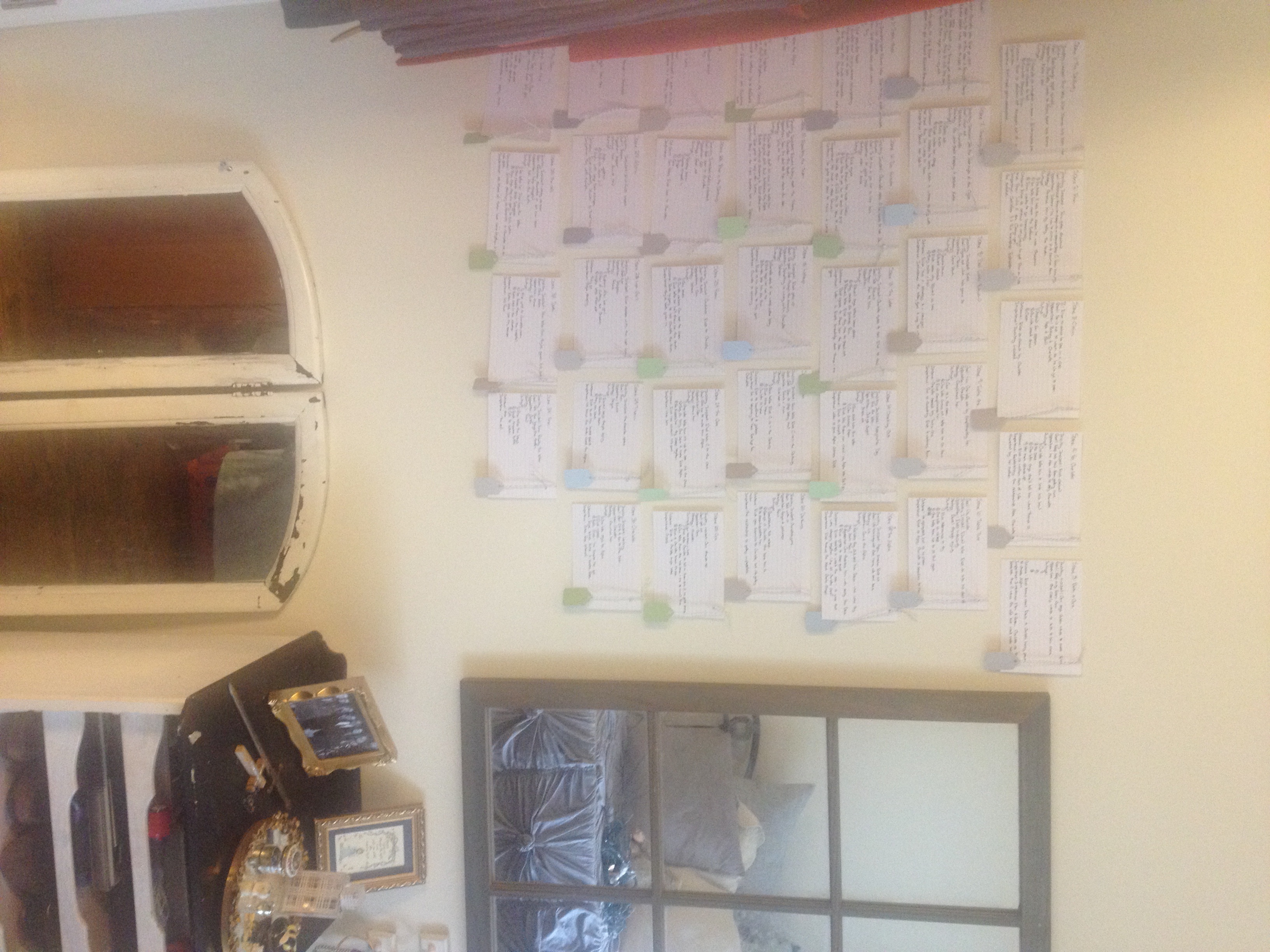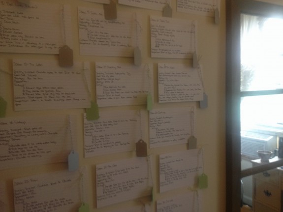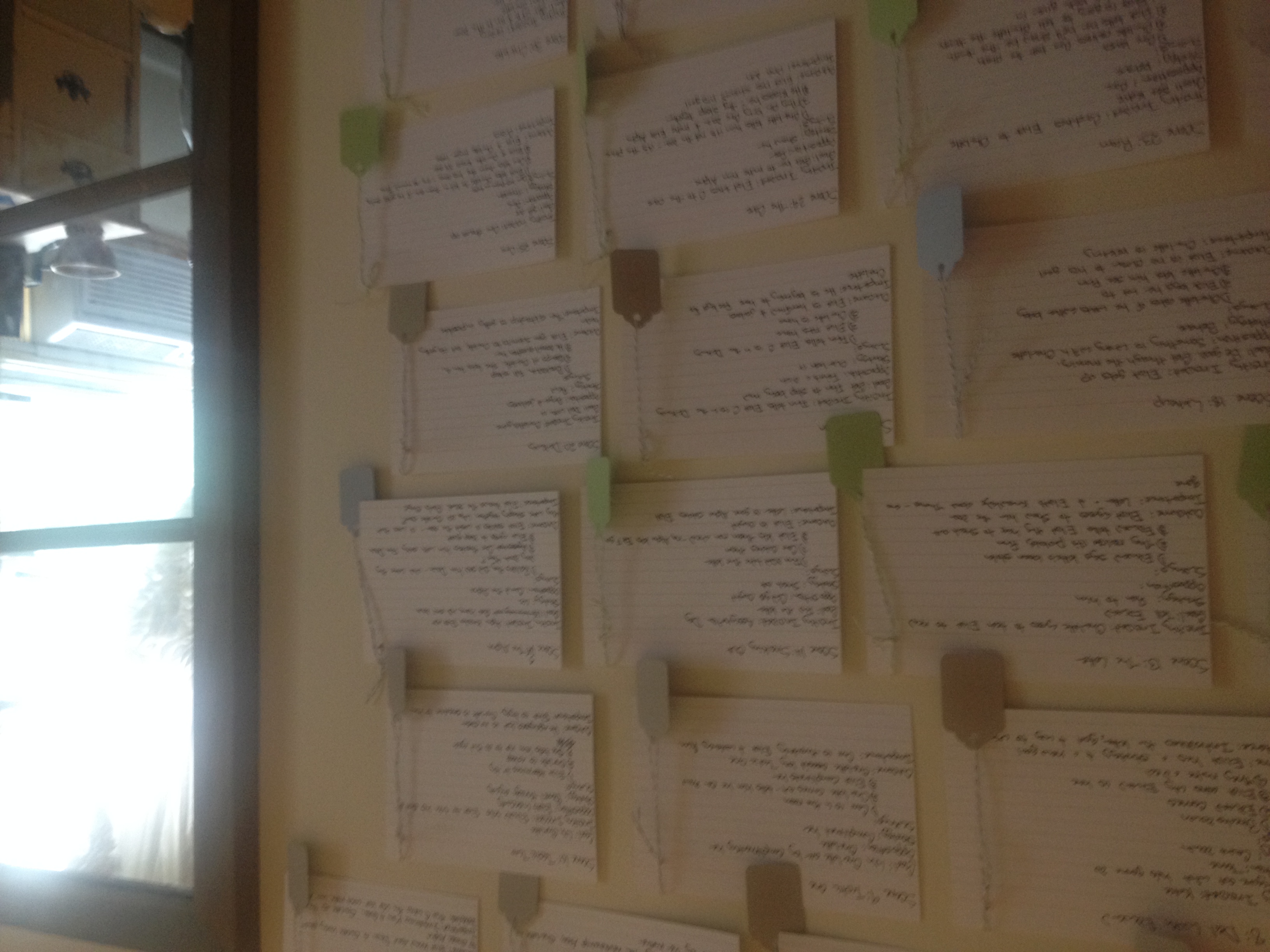 This is the fun part. When you make an outline by hand, you can design it, so that it can continue to do its job–forcing you to think about your whole book. Instead of just writing your outline on a piece of paper, write it on note-cards. A card for each scene. And then put it on the wall. You’ll have a visual representation of your book that you can adjust as your book changes. Not only does the act of making it get you away from the screen and into thinking about your book, but when you’re done you’ll have a powerful tool that you can continue to use as you draft and revise.