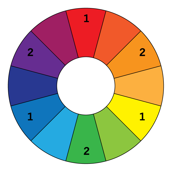 See the color wheel below for primary and secondary colors. Primaries are marked with a 1 and secondaries are marked with a 2.