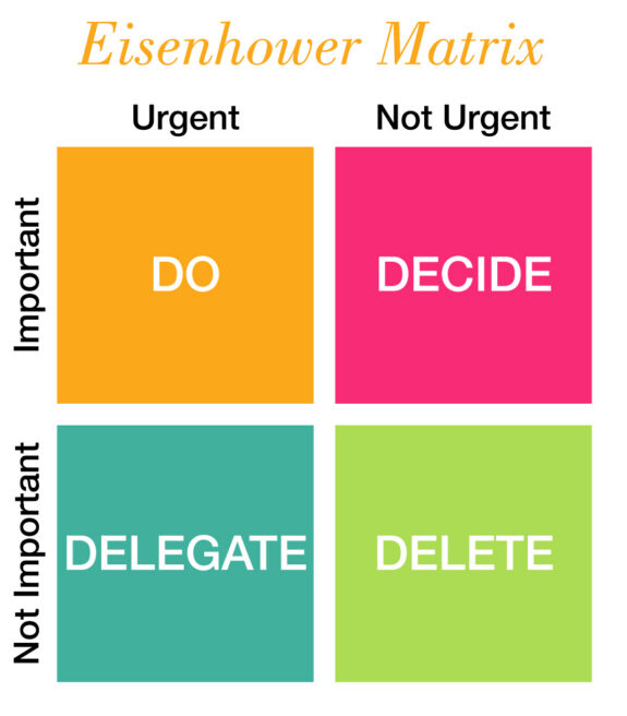 Developed by Dwight D. Eisenhower, this two-by-two matrix considers both task urgency and task importance together. To understand where a task falls on the matrix, all you need to do is ask two yes/no questions: (1) Is the task urgent? and (2) Is the task important? (See the diagram below.) You can use this matrix to figure out what course of action to take with a given task.