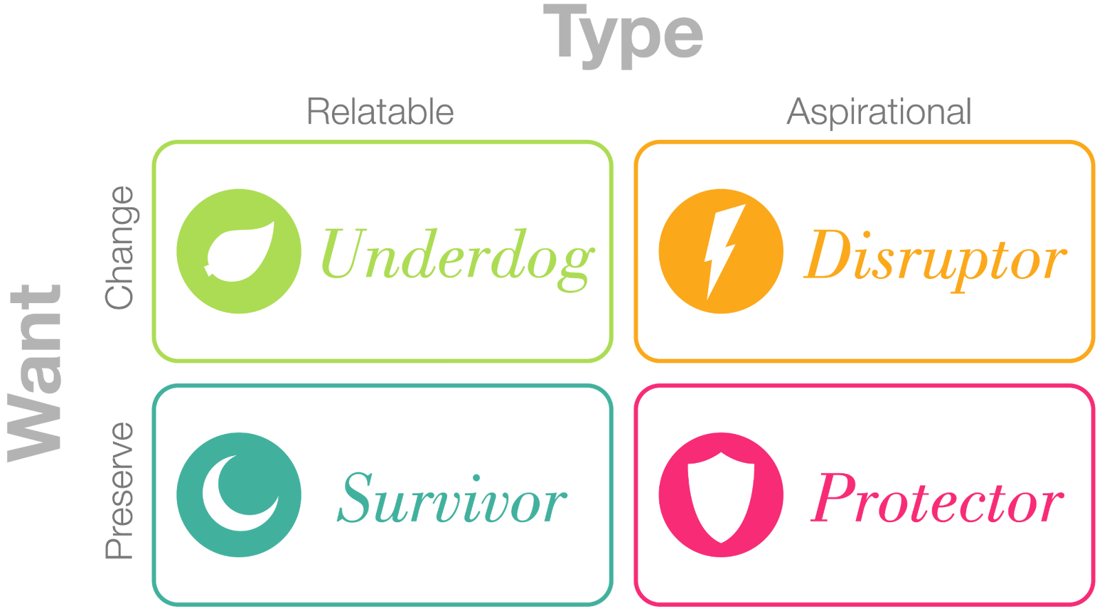 Why do we care about character type and desire? Well, if you cross these two parameters together, you get a 2×2 matrix where each cell of that matrix represents a different character archetype. The underdog is a relatable character who wants change, while the disruptor is their aspirational counterpart. The survivor is also relatable, but now this character seeks preservation, while the protector is their aspirational equivalent. (See the image below.)